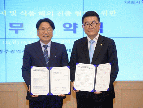 광주광역시는 12일 시청 비즈니스룸에서 광주 김치 및 식품의 해외진출 협력을 위해 세계한식총연합회와 업무협약을 체결했다.