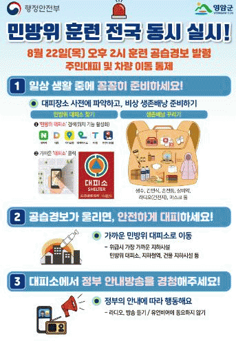 훈련 공습경보가 발령되면 영암군민은 가까운 민방위 대피소로 신속하게 대피해야 하고, 대피소가 없는 경우 안전한 지하공간으로 피하면 된다.