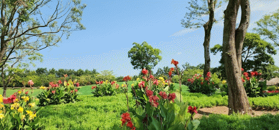 특히 열대식물인 칸나는 이름만큼이나 강렬한 색채를 자랑하는 꽃으로 붉은색, 주황색, 노란색 등 다양한 색상의 꽃들이 정원을 화려하게 수놓아 방문객들의 발길을 사로잡고 있다.