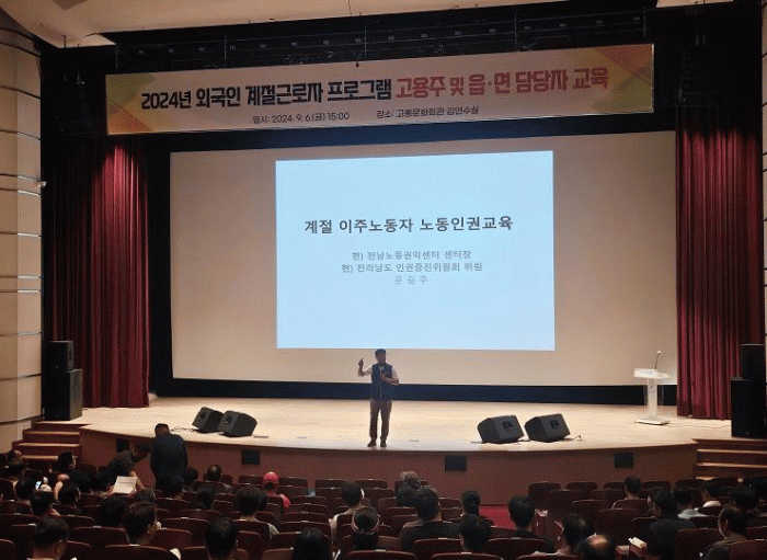 문길주 전남노동권익센터장은 교육 강사로 나서 최근 외국인 계절근로자의 노동인권 문제, 근로기준법 위반, 산재보험 의무 가입 등 필수 절차 및 주요 변경 사항을 안내했다.