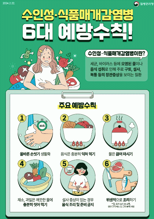 수인성·식품매개감염병을 예방하기 위해서 ▲올바른 손씻기 ▲음식은 충분히 익혀 먹기 ▲물은 끓여 마시기 ▲채소, 과일은 깨끗한 물에 씻거나 껍질 벗겨 먹기 ▲설사 증상이 있을 경우 음식 조리 및 준비하지 않기 ▲위생적으로 조리하기 등 예방수칙을 준수해야 한다.