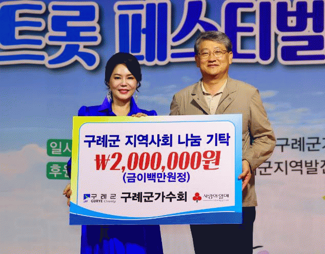 김순호 구례군수는 “구례군가수회의 꾸준한 나눔 실천에 깊은 감사를 드리며, 소외되는 이웃 없이 군민 모두가 함께 행복한 구례를 만들 수 있도록 전달받은 기부금을 도움이 필요한 이웃에게 소중히 전달하겠다”고 말했다.