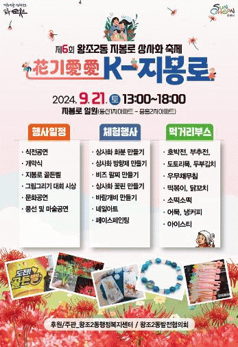 ‘花기愛愛 K-지봉로’라는 주제로 열리는 이번 축제는 개막 퍼포먼스를 시작으로, 왕조2동 주민들로 구성된 라인댄스, 장구난타, 오카리나, 청소년 댄스 등 다양한 공연이 진행된다.