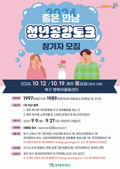 참여 대상은 북구에서 거주하거나 경제활동을 하는 1989년생부터 1997년생까지의 미혼 청년으로 오는 27일까지 ‘남자 15명’, ‘여자 15명’ 총 30명을 모집한다.