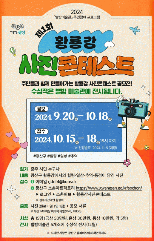 제1회 황룡강 사진 콘테스트에 대한 자세한 내용은 광산구 문화예술과 소촌아트팩토리(062-960-3688)로 문의하면 된다.