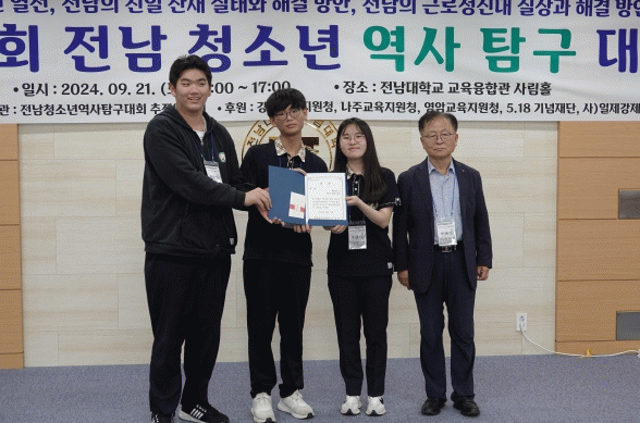 이번 대회의 심사위원을 맡은 박해현 교수(초당대학교)는 “학생들의 수준 높은 보고서 작성과 발표 능력에 감탄했다. 앞으로 전남 청소년의 역사에 대한 관심이 더욱 깊어지기를 기원한다.”며 대회 심사 소감을 말했다.