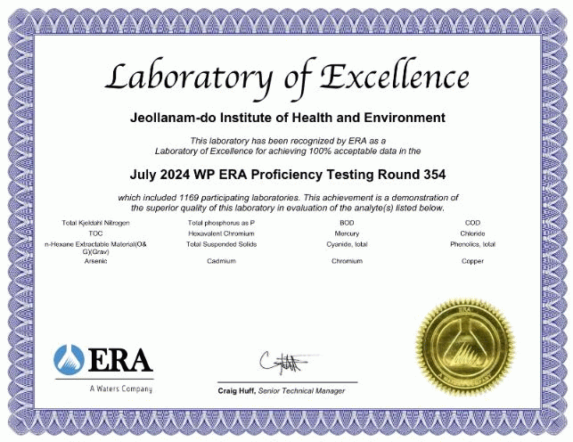 박찬오 전남도보건환경연구원 산업폐수과장은 “국제숙련도 평가를 통해 측정자료의 신뢰도와 정확도에 대해 국제적으로 입증받았다”며 “앞으로도 도민들에게 신속하고 정확한 측정 분석 서비스를 하기 위해 지속해서 노력하겠다”고 말했다.