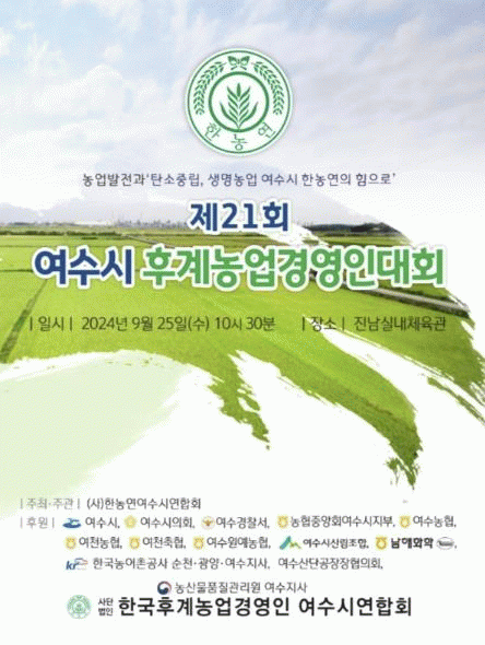한국농업경영인 여수시연합회(회장 장차익)가 주최·주관한 이번 대회는 농업에 대한 최신 정보를 교류하고, 미래 농업을 이끌어 갈 세대 간의 화합·소통을 위해 마련된 행사로, 관내 농업인과 가족, 내외빈 등 450여 명이 참석할 예정이다.