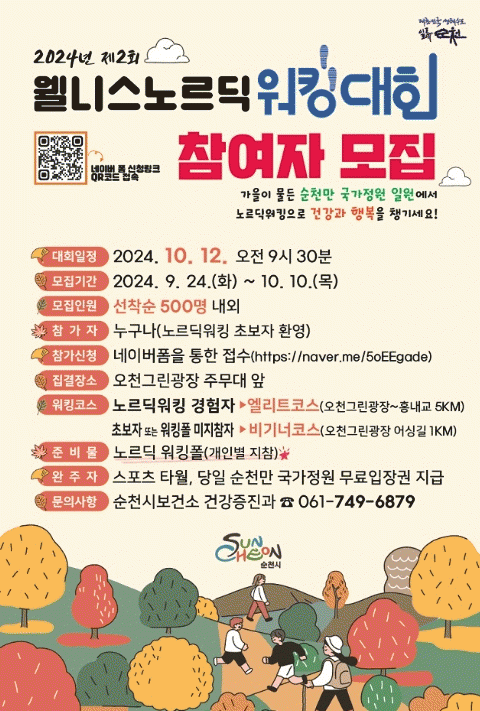 참가비는 무료로 전국 누구나 참여 가능하며, 참여를 원하는 분은 10월 10일까지 순천시 대표 SNS(블로그, 페이스북, 인스타), 순천시 누리집에서 네이버폼(QR코드)을 통해 신청 접수하면 된다.