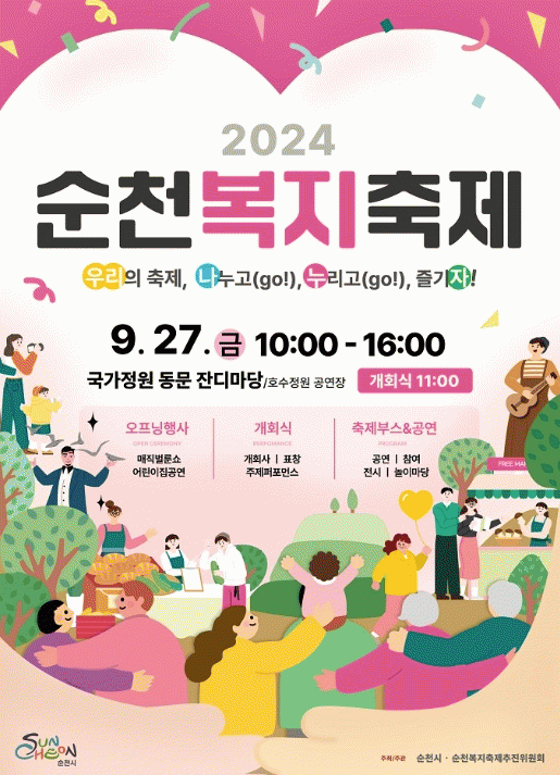 시 관계자는 “이번 축제를 통해 순천복지 발전에 기여하는 후원자들과 복지 관련자들이 한자리에 모여 힐링하고 홍보하며 즐길 거리를 제공하겠다”며 “시민들의 많은 관심과 참여를 바란다”고 말했다.
