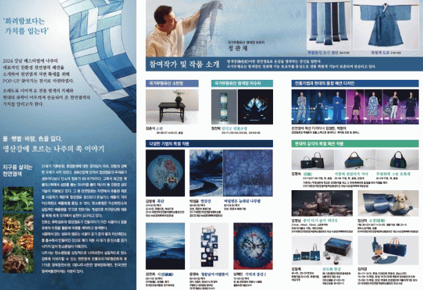 정관채 국가무형유산 염색장을 비롯해 천연염색 작가 30여명의 다양한 기법의 전통과 현대가 어우러진 쪽 염색 작품, 패션 디자인 40여점과 나주의 또 다른 국가무형유산인 김춘식 소반 등을 선보인다.
