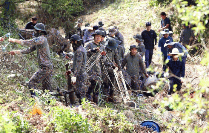 군은 지난 24일, 이번 비로 많은 피해를 입은 작천면 교통 소하천에 공무원 80명을 투입하고, 여기에 육군 31사단 2대대 장병 30명들이 힘을 합해, 토사와 잔해물 처리 등 대민 지원에 구슬땀을 흘렸다.