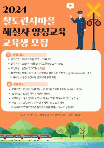 교육과정은 10월 7일부터 12월 2일까지 매주 월요일에 조곡동 행정복지센터 회의실에서 진행될 예정이며, 교육내용은 철도관사마을 역사, 해설사의 역할, 해설사 마인드, 해설 실습 등으로 운영한다.