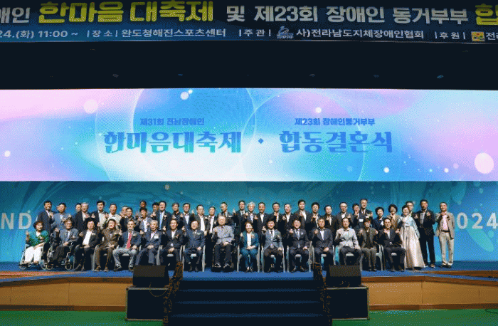 전남도와 완도군이 함께 주최하고 (사)전남지체장애인협회가 주관하는 이번 행사는 완도청해진스포츠센터에서 기념식과 합동 결혼식, 어울림 한마당 잔치 등이 진행됐다.
