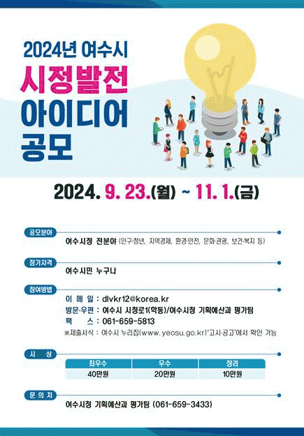 우수제안자에게는 ▲최우수상(95점 이상) 40만 원 ▲우수상(75부터 94점) 20만 원 ▲장려상(65부터 74점) 10만 원 상당의 여수사랑상품권이 지급된다.