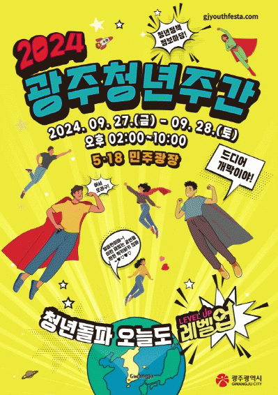 ‘2024 광주청년주간’ 주요 프로그램은 ▲청년들에게 희망·격려·도전·실행력·용기 등을 주제로 진정성 있게 메시지를 전달할 서경덕 교수의 ‘청년 레벨업 토크쇼’ ▲광주 청년들의 현생과 갓생에 대해 이야기하는 ‘청년, 꿈꾸는 갓생토크’ ▲대학 교류 경연 프로그램으로 ‘대학 댄스동아리 교류전’, ‘청년 K-POP 커버댄스 경연대회’ 등이다.