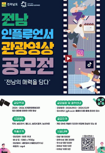 주순선 전남도 관광체육국장은 “이번 공모전을 통해 전남의 숨겨진 보석 같은 매력을 전 세계 인플루언서의 시선으로 새롭게 조명하길 기대한다”며 “우수한 영상 콘텐츠를 통해 전남이 국제적으로 더욱 널리 알려지길 바란다”고 말했다.
