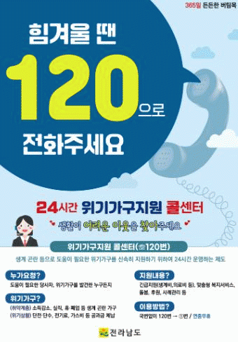 이호범 전남도 사회복지과장은 “120콜센터는 연중무휴로 365일 24시간 운영되고 있다”며 “도움이 필요한 분이나, 주변에 그런 이웃을 발견하면 언제든지 국번 없이 120번으로 전화하면 도움을 받을 수 있다”고 말했다.