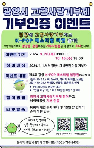 당첨자들에게는 고향사랑기부제 참여 시 제공되는 세액공제 및 답례품 혜택 외에 제4회 광양 K-POP 페스티벌 공연 입장권을 추가로 증정할 예정이다.