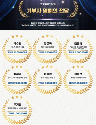앞서 고액 기부로 여수시 명예의 전당에 오른 기부자는 방성옥 대표를 비롯해 김종기 전라남도 자치행정국장, 이종원 부안군 사업가, 주기면 재광주여수시향우회장 등이 있다.