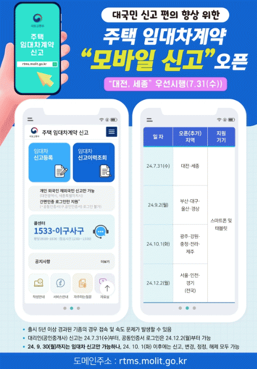 신고 방법은 계약당사자 또는 위임인이 주택 소재지 관할 읍면동 주민센터를 방문하거나 온라인으로 신고할 수 있으며, 10월 1일부터는 모바일로 ‘부동산거래관리시스템’에 접속해 본인인증을 거쳐 신고사항을 입력하면 된다.