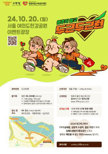 이번 마라톤 코스는 여의도공원-국회의사당-성산대교를 통과하는 총 9km로 1km마다 심정지 환자 발견 시 필요한 심폐소생술 단계를 학습할 수 있는 펀런(FUN RUN) 형식으로 진행되며, 참가를 원하는 국민 누구나 참여 가능하다.