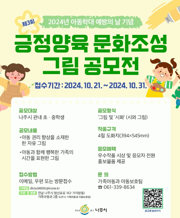 공모전과 관련하여 자세한 사항은 나주시 누리집 공고문을 확인하거나 가족아동과 아동보호팀(☎061-339-8634)으로 문의하면 된다.