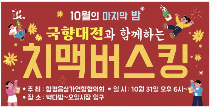특히 국향대전 기간 중 10월 31일 오후 6시부터 함평읍 상가연합회 주관으로 시월의 마지막 밤을 기념하는 치맥 버스킹 행사가 함평읍 빽다방부터 함평천지전통시장 구간에서 열린다.