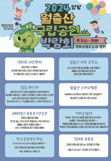 11/1~3일 영암군이 영암읍 영암종합운동장 일대에서 ‘월출산, 달빛 넘나들이’를 주제로 ‘2024 월출산국립공원박람회’를 개최한다.