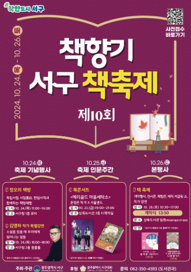한미 도서관과장은 “작가와의 만남 확대, 쉼터 공간 확충, 청소년 프로그램 등 지난해 책축제 참가자들의 의견을 반영해 올해 축제를 보다 풍성하게 준비했다”며 “책을 좋아하고 가을날 야외에서 여가를 즐기고 싶은 시민 모두를 초대한다”고 말했다.