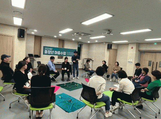 이번 중장년 마음수업은 40대 부터 50대 지역주민을 대상으로 심리코칭 연구소 이용희 소장의 진행하에 자아 성찰의 시간 및 인생을 회상하고, 미래 방향 설정 방법을 안내하는 내용으로 실시됐다.
