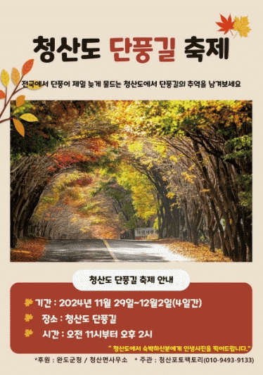 청산면사무소 관계자는 “청산도 단풍길 축제는 주민들이 만들어가는 행사로 청산도의 푸른 산과 바다가 어우러지는 멋진 경관과 늦가을 정취를 만끽해보시길 바란다”라고 말했다.