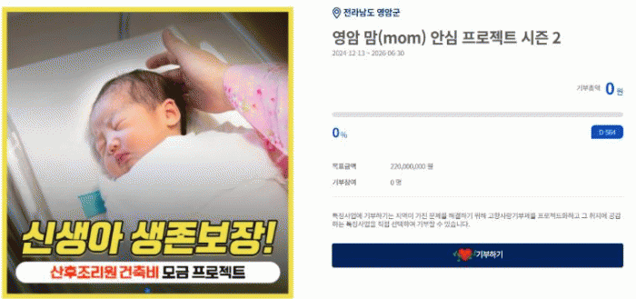 모금에 앞서 영암군은 지난해 ‘영암 맘(mom) 안심프로젝트 시즌1’로 공공산후조리원 의료장비 구입비 2억2,000만원 모금을 성황 속에 완료했다.