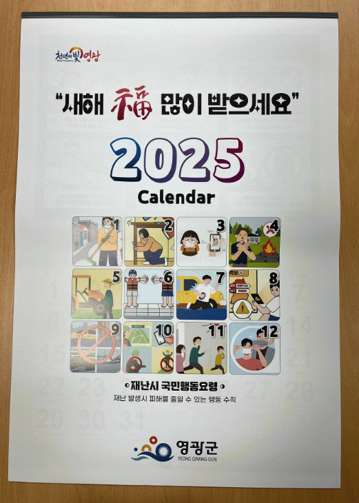 영광군이 제작한 안전달력은 ▲대설 ▲산불 ▲폭염 ▲태풍 ▲지진 ▲화재 등 연중 발생빈도가 높은 12가지 재난 유형을 소개하고 각 달에는 해당 재난에 대하여 안전 대처 요령 및 예방 수칙이 시각적 이미지와 함께 제공되어 군민들이 쉽게 이해하고 실천할 수 있도록 구성됐다.