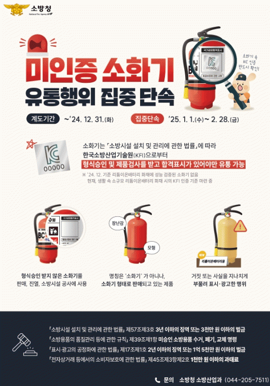 이번 단속은 화재 발생 시 중요한 역할을 하는 소화기의 안전성 확보와 소비자 보호를 위한 조치로, 특히 미인증 소화기가 화재 초기 진압에 실패할 경우 큰 피해를 초래할 수 있다는 점에서 긴급히 필요하다고 강조했다.