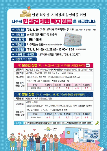 31일 나주시에 따르면 지원금은 1인당 10만원으로 온라인, 현장 신청을 통해 지역화폐인 나주사랑상품권(모바일·지류형 중 선택)으로 지급하고 있다.