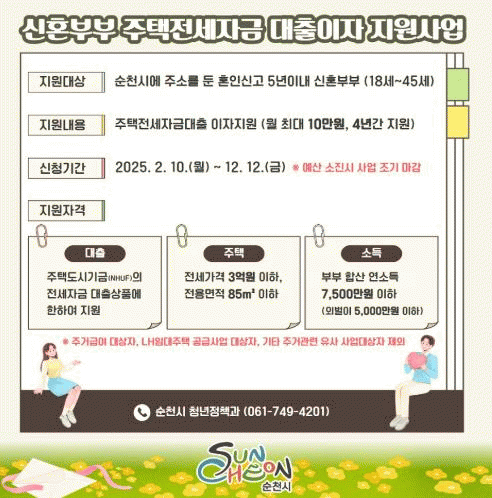 신혼부부 주택전세자금 대출이자 지원사업은 순천시에 거주하는 무주택 신혼부부에게 전세자금 대출이자를 월 10만 원씩 최대 4년간 지원하는 사업이다.