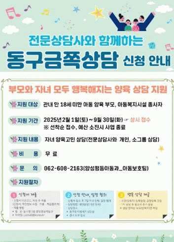 올해로 2년 차가 된 ‘동구 금쪽 상담’ 사업은 상담 전문가가 부모의 양육 고민을 진단하고, 효과적인 해결책을 제시해 긍정적인 양육 환경을 조성하기 위해 마련됐다.