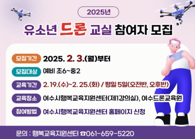이번 프로그램은 유소년이 드론 관련 기술을 습득하고 창의적 사고 및 문제해결 능력을 함양하기 위한 것으로, 2월 19일, 20일, 21일, 24일, 25일 총 5회 운영된다.