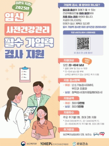 올해부터는 건강한 임신 및 출산환경을 조성하기 위해 결혼 여부 및 자녀 수와 관계없이 검진을 희망하는 20~49세 남녀 모두에게 필수 가임력 검사비를 지원한다. 또한 생애주기에 따라 29세 이하(제1주기), 30~34세(제2주기), 35~49세(제3주기)로 나누어 최대 3회까지 지원받을 수 있도록 지원을 확대했다.