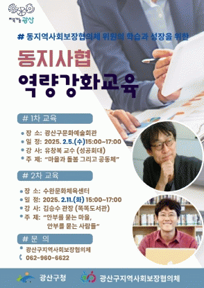 1차 교육은 5일 오후 3시 광산문화예술회관에서 유창복 성공회대 교수의 ‘마을과 돌봄 그리고 공동체’를 실시한다. 2차 교육은 오후 3시 수완문화체육센터에서 김승수 인하대학교 사회복지학과 겸임교수가 ‘안부를 묻는 마을 안부를 묻는 사람들’을 주제로 실시한다.