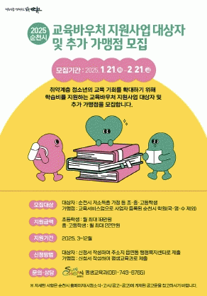 교육바우처 지원 사업은 기초수급자와 차상위계층 가정의 초·중·고등학생 100여 명에게, 국·영·수를 제외한 예체능, 직업기술, 제2외국어 과목에 대해 시에서 65%, 순천시에 등록된 가맹 학원에서 35% 학원 수강료를 지원하는 사업이다. 또한, 기초수급자와 차상위계층 가정 이외에도 한부모, 조손, 다자녀 가정까지 기준수강료(초등학생 18만원, 중고등학생 22만원)의 100%를 지원한다.