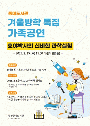 ‘호야박사의 신비한 과학실험’은 2월 15일 오후 3시에 광양중마도서관에서 열린다. 가족 공연 전문단체 ‘힐링 매직’이 행사를 진행하며, 전기·바람·공기 등 자연 현상을 어린이 눈높이에 맞춰 쉽고 재미있게 설명하는 어린이 과학 체험 쇼로 공연이 기획됐다.