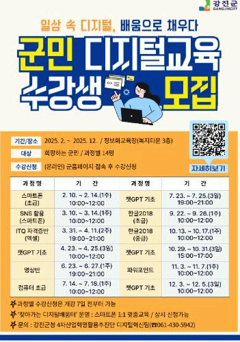 특히 AI(인공지능) 기술을 활용한 ‘챗GPT 기초’ 과정은 연중 4회 운영될 예정이며, 군민들이 직접 챗GPT를 활용해 영상과 이미지를 제작하는 실습을 경험할 기회를 제공한다.