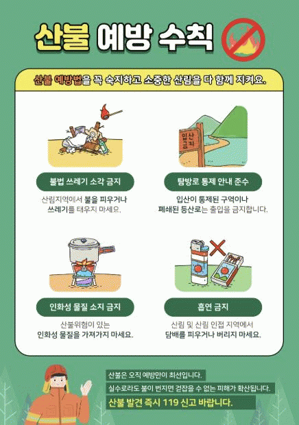 산림 지역에 인화성 물질을 소지하는 것은 큰 위험을 초래할 수 있습니다. 가연성 물질을 소지하고 입산하는 것은 금지됩니다.