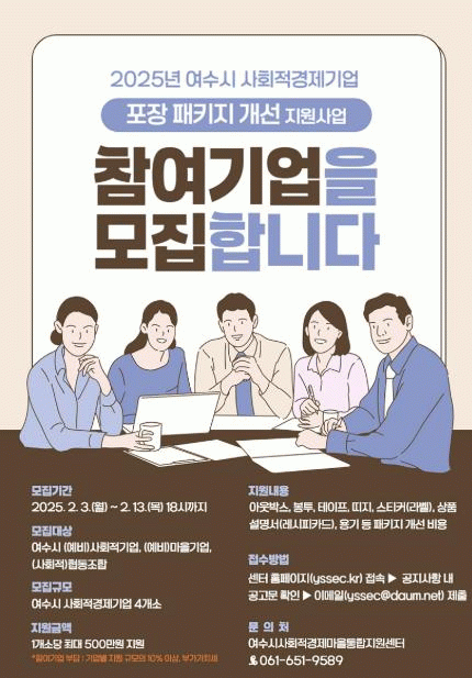 여수시 관계자는 “이번 지원사업을 통해 유사 경쟁 상품 사이에서 두각을 나타내고 시장 인지도를 높여 판로를 확대하는 계기가 되길 바란다”고 전했다.