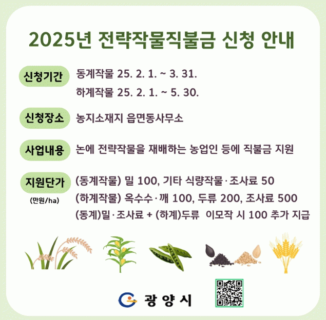 우미자 광양시 스마트원예과장은 “전략작물직불제 지원을 통해 쌀 적정 생산과 식량자급률 향상에 기여할 것으로 기대한다”며 “논 이용률을 높이고 농가 소득 증대에 도움이 되는 이번 사업에 많은 농업인이 관심을 갖고 참여하길 바란다”고 말했다.