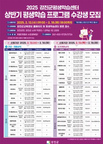 자세한 사항은 강진군 홈페이지 고시?공고 또는 교육정보 홈페이지(평생학습-강좌신청)를 참고하거나, 총무과 교육교류팀에 문의하면 된다.