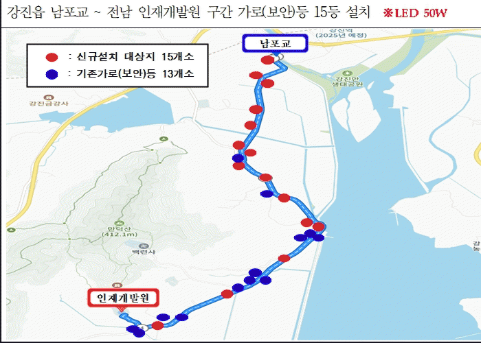 그동안 이 구간은 야간 조도가 낮아 교육을 마친 후 귀가하는 교육생뿐만 아니라, 인근 마을 주민들에게도 불편과 위험 요소로 작용해 왔다. 이에 따라 강진군은 교차로와 시야 확보가 어려운 도로 곡선 구간 등 사고 위험이 높은 지역을 우선으로 개선하는 데 초점을 맞췄다,