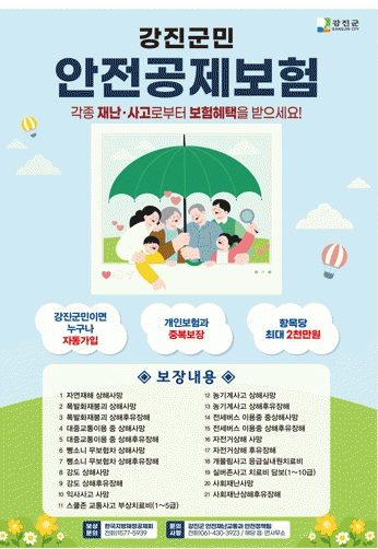 강진군에 주민등록을 둔 군민이나 등록 외국인은 일상생활에서 발생한 재난이나 사고로 피해를 입은 경우 사고 발생일로부터 3년 이내에 군민안전보험을 신청해 혜택을 받을 수 있다. 자세한 안내는 강진군청 안전재난교통과로 문의하면 된다.